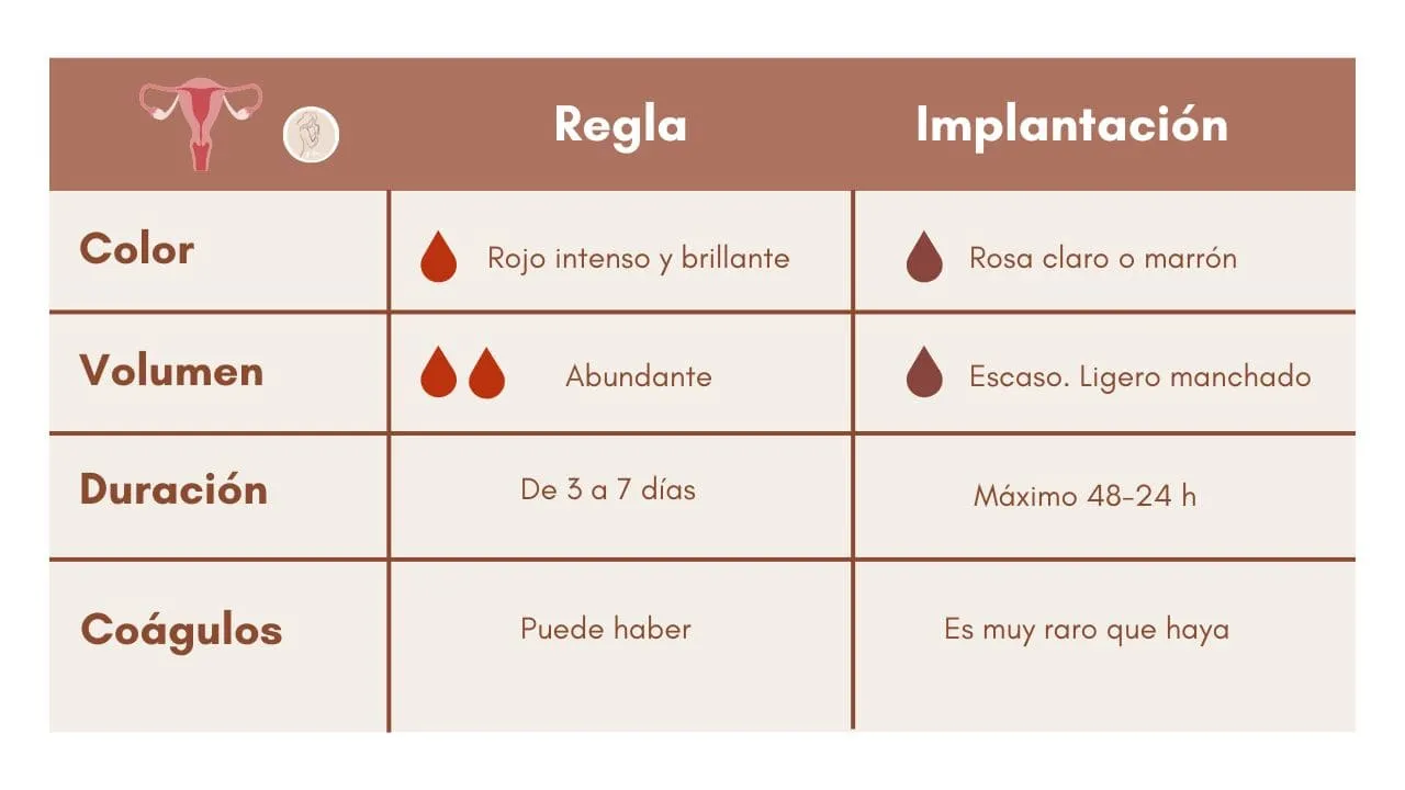 La regla, como ya sabes tiene un color rojo intenso. En cambio el sangrado de implantación es de un color rojo más oscuro o marrón.